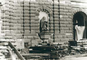 Jahrzehnte später - zu Beginn der achtziger Jahre - lag die Oper dann hinter einem Bretterzaun in der Sonne, umsponnen von Stahlgerüsten, und auf den Gerüsten sich bewegendes Weiß; - Stuckateure und Steinmetzen. Ob auch ich bei der Restaurierung der Semperoper Dresden mitarbeiten wollte, fragte man mich. Und so betrat ich im September 1980 zum zweiten Male die Semperoper.