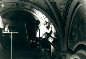 Mara stieg von der Fußbank, Malstock und Farbnäpfchen in der einen, Pinsel in der anderen Hand, stieg vom ersten Podest, vom zweiten, stand vor mir. „Komm!“ sagte sie. Wir liefen über die Bretteretage. Die Bretter vibrierten bei jedem Schritt, waren nur lose über die Stahlrohre gelegt. Durch die Lücken sah ich die Stuckateure unter uns. Mara ging mit mir zu den Kappensegmenten, die ich bemalen sollte. Sich überschneidende Gewölbe, von Scheinwerfern aus dem Dämmer gerissen, teils fertig bemalt, teils eben begonnen. Im filigranen Linienornament von Ockertönen ein Blau, - da sah das Ocker wie Gold aus.